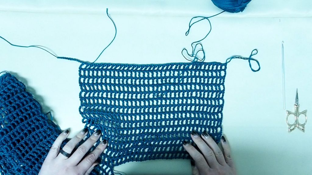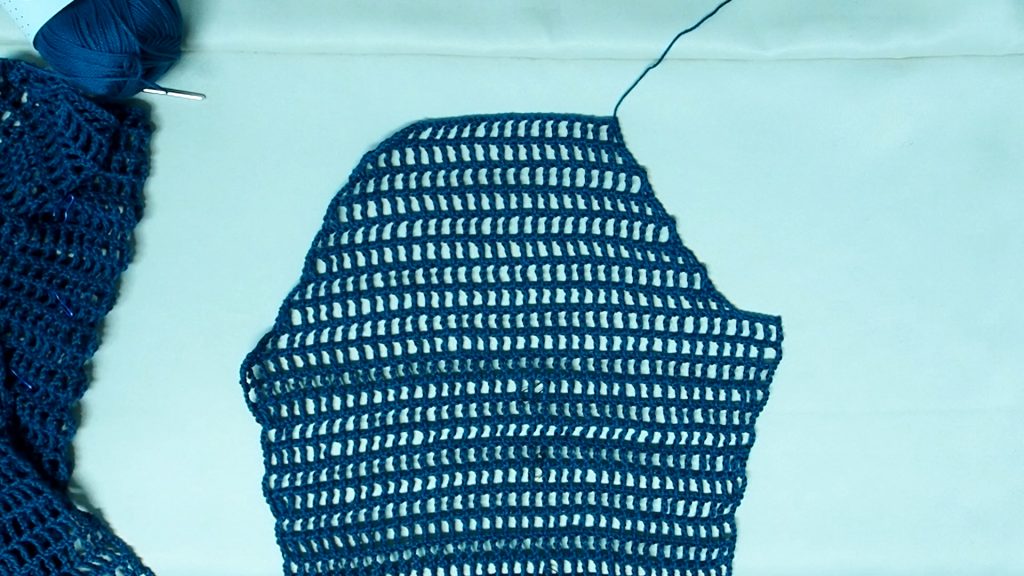 Secure your yarn onto the last stitch of the other shoulder. Crochet a foundation chain to match the first front piece. Cut the yarn and cast off the chain.