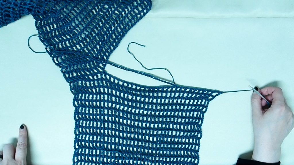 Continue to crochet until you reach the pit. On this side, create an added foundation chain. Secure a loose end of yarn onto the side of the front piece and crochet a foundation chain to house four triples again. Cut the yarn, and cast off the chain. To end the row, use the added foundation to triple crochet and chain four times. Crochet until you reach the hem, and return to the shoulder.