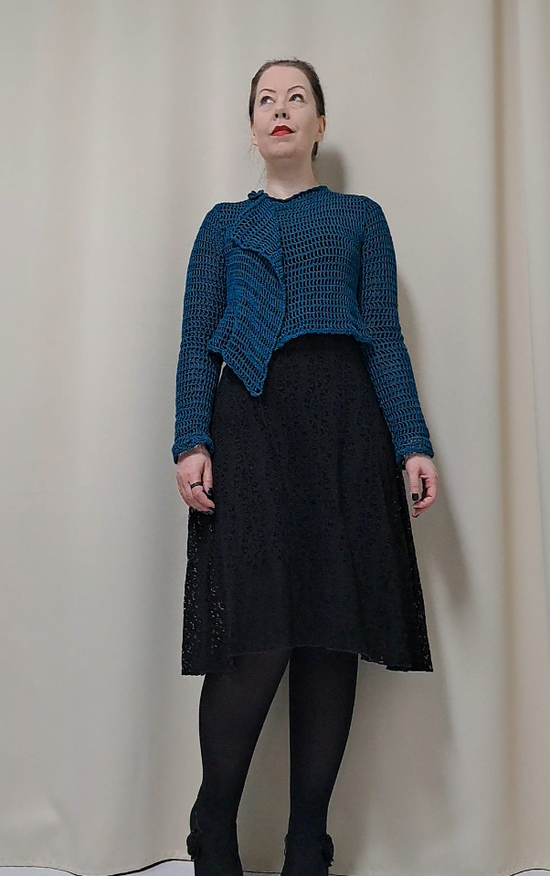 A long time ago, I got colourful cottons from a sale. They’ve been properly marinated now, and the blue yarn summoned me. It wanted to be a cardigan of an unusual style. I cast on, remembered to film the crochet process, and thoroughly loved the result. Today, I will share a written tutorial with you!