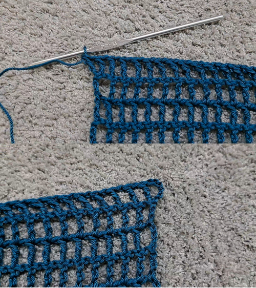 Slip stitch into the edge to move to the fourth triple crochet from the edge. Chain four to turn, and triple crochet into the next stitch. Work through the row until you’re five triples away from the edge. Without chaining one, triple crochet into the last stitch. Chain four to turn, and triple crochet into the first lonely stitch.
