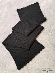 Continue to knit all stitches on both sides until your scarf is long enough. Cast off, and weave in ends. As an optional step, crochet a shell edge onto both short ends. For that, pick up a crochet hook size 4mm. Secure the yarn onto the edge of your scarf, skip two stitches, and into the third, triple crochet five times. Skip two, and single crochet into the next stitch. Continue like this through the short edge, and repeat on the other end.