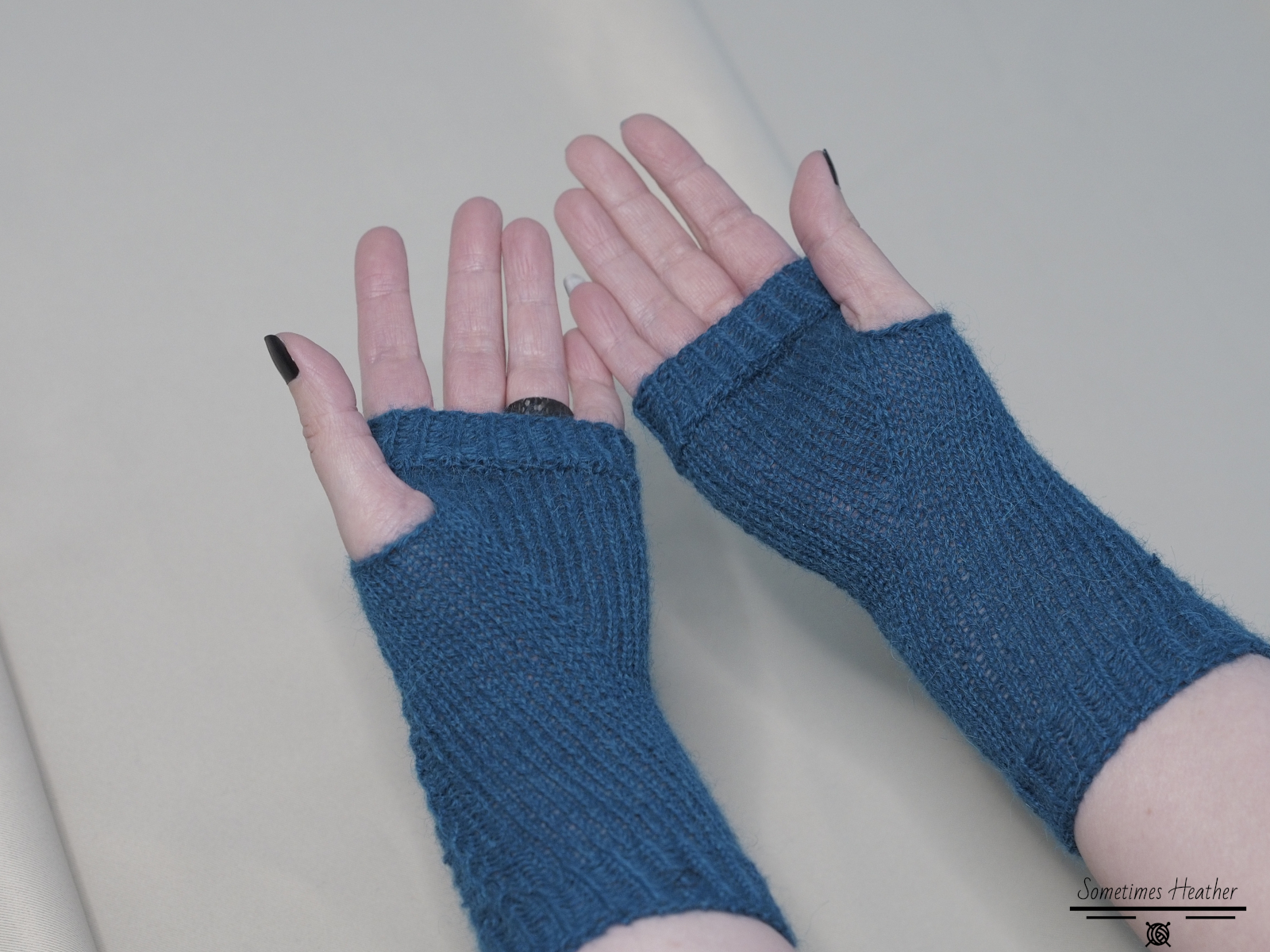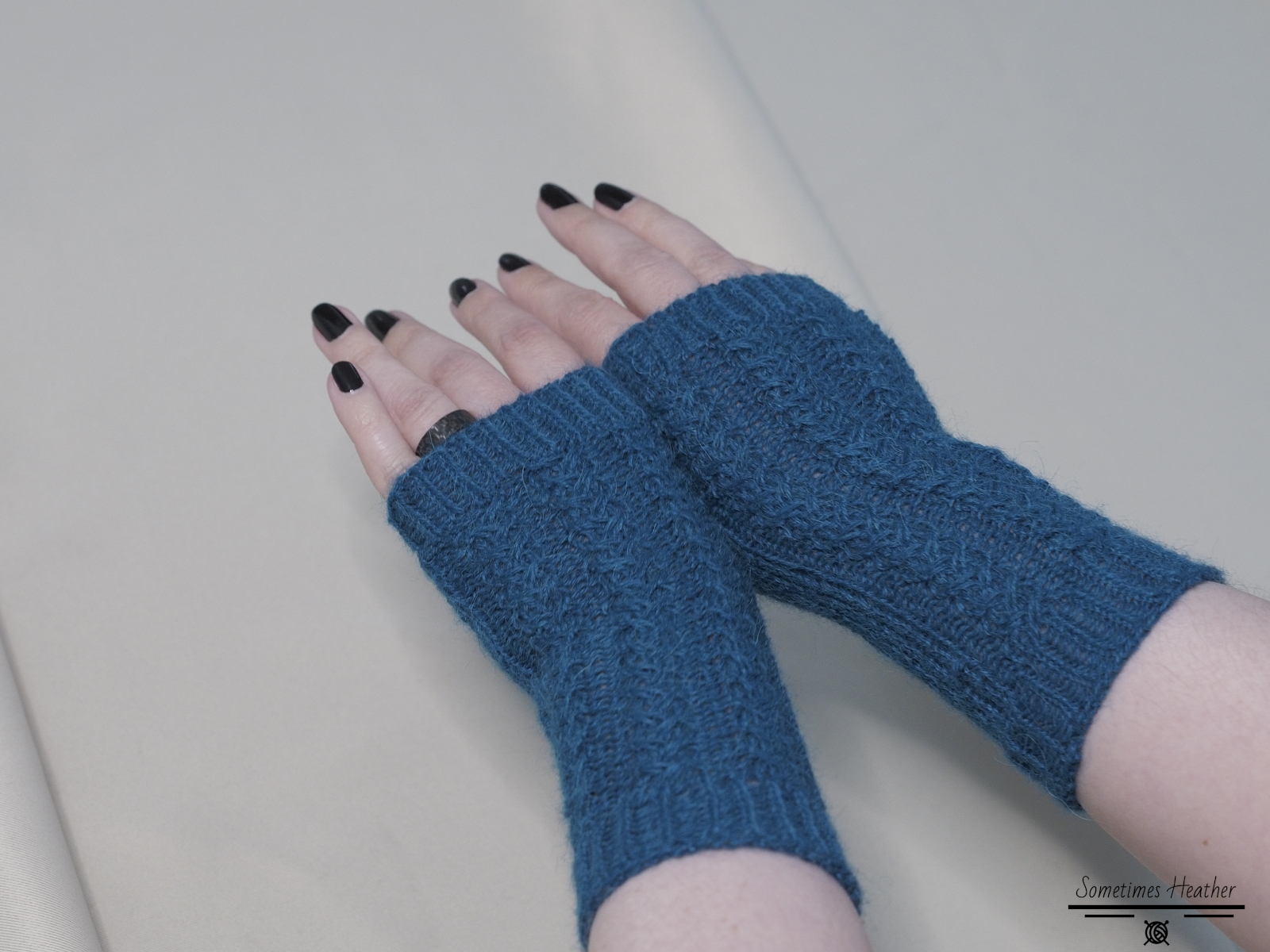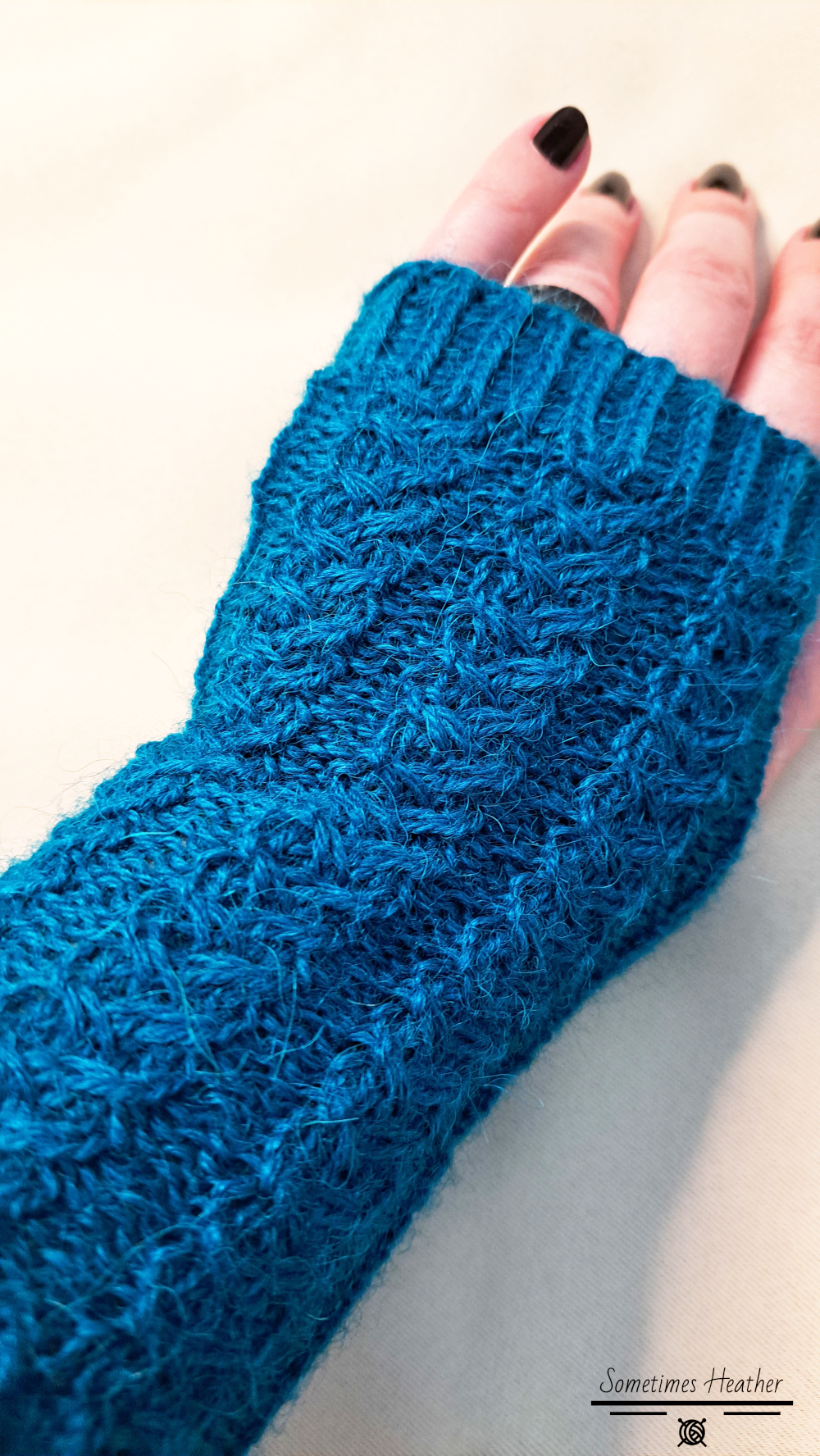 Moments is an intermediate level knitting pattern. It shows you how to knit short fingerless gloves decorated with cable columns.